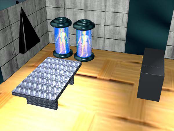 A la derecha de quien entra, en la pared perpendicular a aquella en donde están los cilindros transparentes, hay, extrañas ventanas negras, triangulares, con los contornos biselados, que no se sabe en realidad qué sean. Los dos cilindros transparentes están llenos de un líquido azulado/amarillo-verde (se trata, tal vez, de fenómenos de iridiscencia, o sino por la diferente percepción de la cual se hablaba anteriormente).